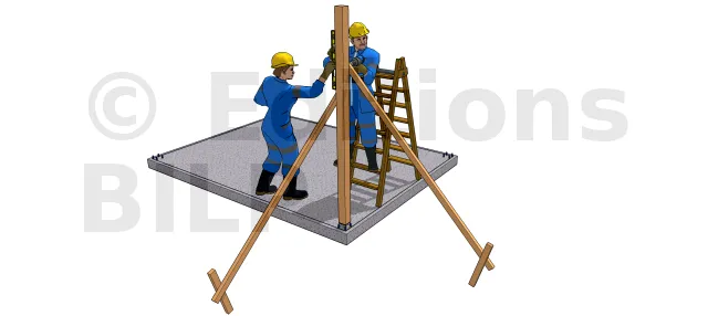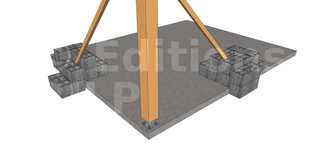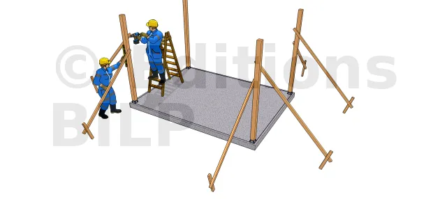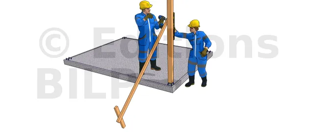 Dans les étapes de mise en oeuvre ci-après, on suppose que la dalle de support est parfaitement horizontale pour recevoir des poteaux de même longueur. Cette technique est valable également pour un terrain plat permettant d’ancrer des pieds de poteaux au même niveau et aussi sur un terrain faiblement en pente avec des surfaces de plots en béton de même niveau.