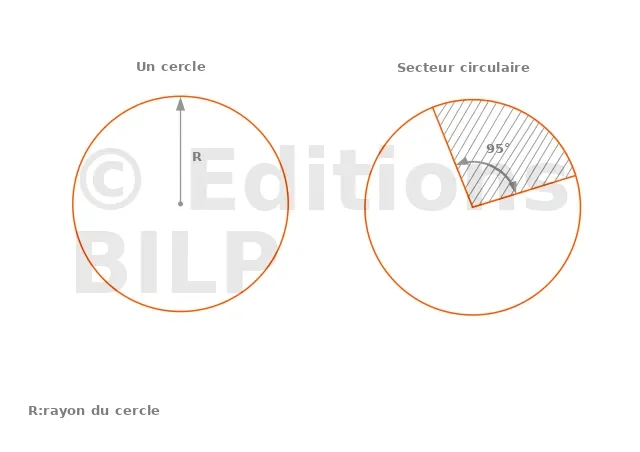 - Surface [m²] = πR² x Angle / 360, soit S = (3,14 x 5²) x 95 / 360 = 20,72m²