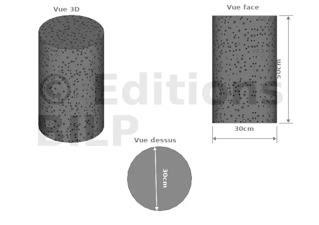 Nous cherchons à faire le devis du volume de béton pour mettre en œuvre 15 plots en béton avec un rayon R = 15cm et une profondeur L = 0,50m.