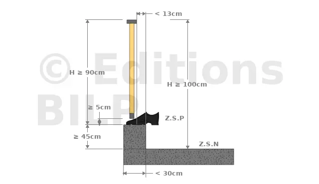 La norme NF P 01-012 stipule que l’installation d’une rambarde s’impose dès lors que la hauteur de chute est supérieure à 1 m à compter de la zone de stationnement normal ou de la zone de stationnement précaire.