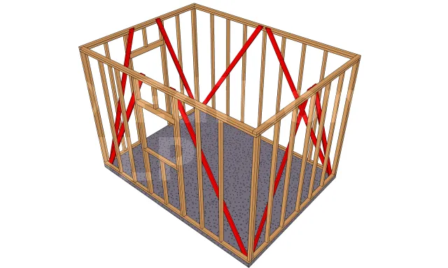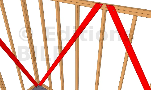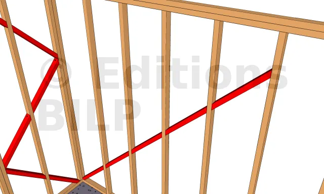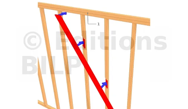 Les écharpes (en rouge) sont disposées en oblique et fixées sur les montants d’ossature. idéalement, chaque pan de mur (palée) reçoit au moins deux écharpes, une orientée à l’opposé de l’autre. Pour les petites constructions, on peut mettre une seule écharpe par mur mais il faut orienter une écharpe dans un sens donné, et mettre l’autre écharpe dans l’autre sens sur le pan de mur parallèle au premier.