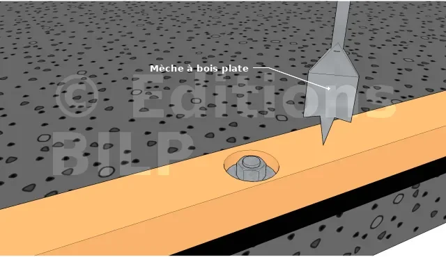 - 2 : Insérer la tige filetée en appliquant un mouvement rotatif pour bien faire adhérer la colle autour de la tige. Enlever immédiatement le surplus de colle. Attention, vérifiez bien que la tige n’est pas trop enfoncée. Elle doit dépasser de quelques centimètres au dessus de la traverse.