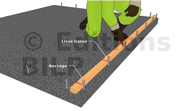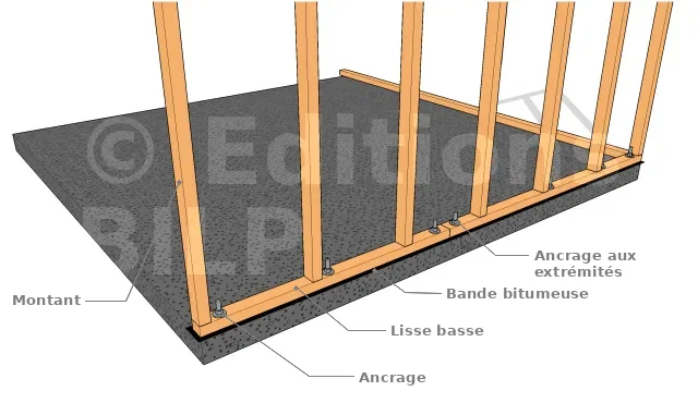 La pose de la traverse basse est délicate car il faut éviter d’une part les attaques biologiques et d’autre part les remontées capillaires de la dalle. En règle générale, la traverse basse doit se trouver à au moins 20 cm du terrain naturel.