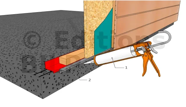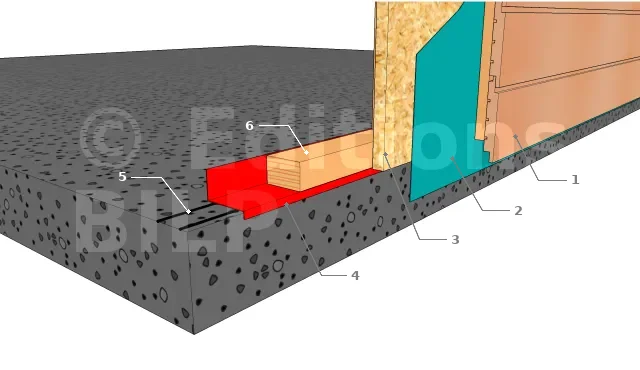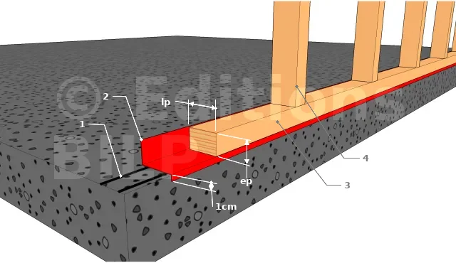 Il faut disposer une bande bitumeuse entre la traverse et le béton. Cette bande évite le contact du bois avec l’humidité. Car même si elle n’est jamais exposée aux intempéries, une dalle peut présenter des remontées humides par capillarité. La bande peut dépasser de plusieurs centimètres vers l’extérieur. Au moment de la fixation du bardage, on repliera vers le bas la portion dépassante. Voir la méthode pose d’une bande bitumineuse suivant la méthode ci-bas.
