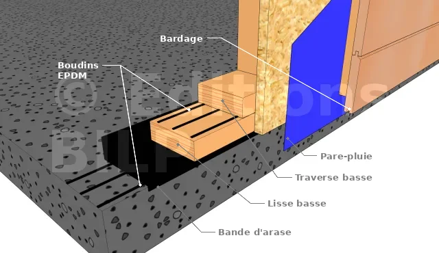 Du côté extérieur, le bardage ainsi que le pare-pluie descendront de quelques centimètres et participeront également à la protection de la lisse basse. Il faudra intercaler des boudins EPDM entre la lisse basse et le béton ainsi qu’entre la traverse basse et la lisse basse pour assurer l’étanchéité à l’air.