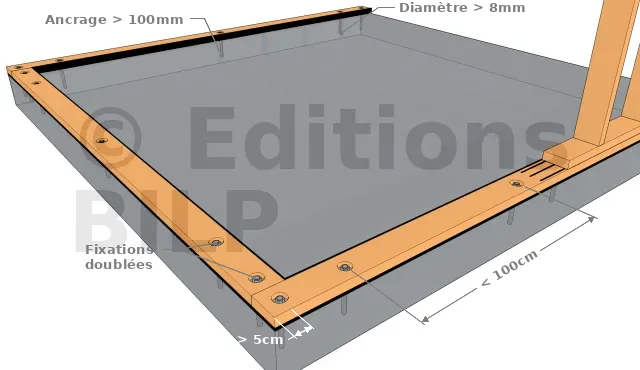 Les éléments de fixation doivent être à 1 m d’intervalle au maximum et à 5 cm du bord au moins ; ils doivent aussi être doublés à chaque extrémité et au droit de chaque ouverture. Le diamètre minimum préconisé est de 8 mm et l’ancrage dans le béton doit être de 100 mm au moins. Il est également important de s’assurer que les têtes de fixation ne dépassent pas la lisse basse étant donné que la traverse basse y sera fixée. Pour ce faire, il faudra créer des trous borgnes dans lesquelles les têtes de fixation se logeront.