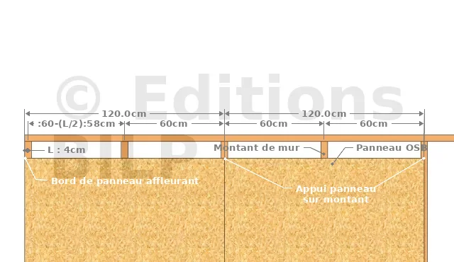 Cependant aux extrémités, l’entraxe est légèrement plus petit. On prend un entraxe correspondant au multiple moins une demi largeur de montant, de façon à ce que le panneau arrive bien au bord.