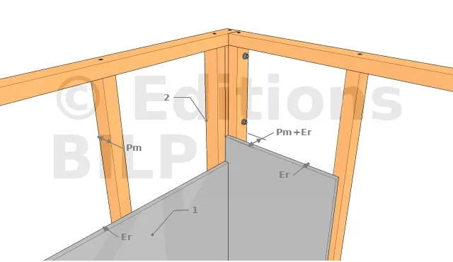 Si le mur doit recevoir un revêtement intérieur (panneaux, placo, lambris, etc.), il faut prévoir un montant en support proche de l’extrémité du mur, en doublage du dernier montant. Il y a donc deux montants à l’extrémité, quasiment côte-à-côte. L’entraxe entre ces deux montants est équivalent à la profondeur Pm d’un montant plus l’épaisseur Er du revêtement intérieur.