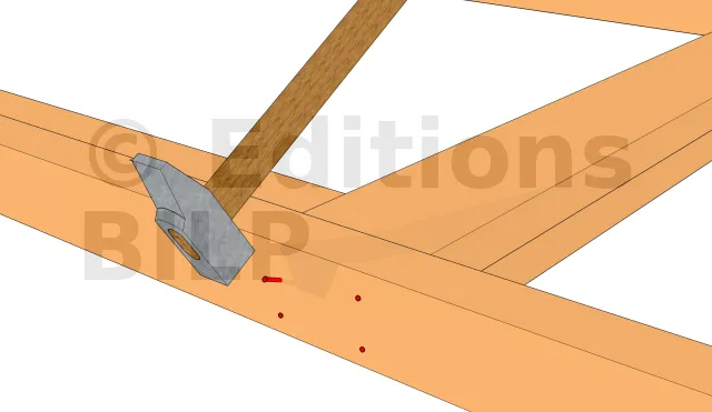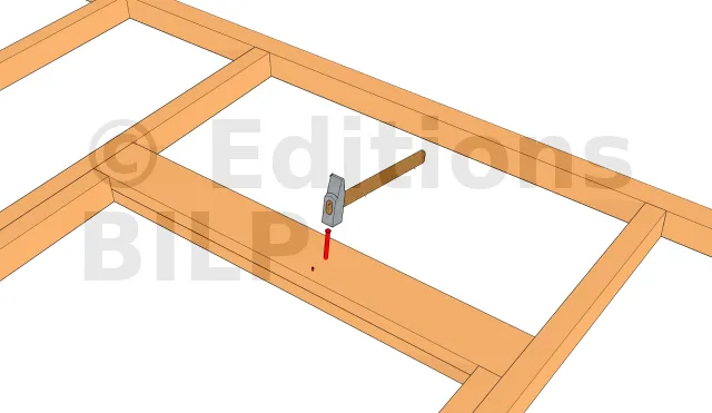 Il faut commencer par séparer la lisse basse et la sablière qui ont été marquées simultanément. A plat au sol, formez le cadre qui constituera le pan de mur. En clouant, veillez à clouer en biseau afin d’assurer une meilleure solidité. Il est parfois utile de s’exercer sur des chutes de planches pour acquérir la bonne technique. Rater le clouage peut en effet fendre un poteau. Pour éviter les vilains coups de marteau, enfoncez délicatement les clous jusqu’à une certaine profondeur avant de frapper précisément et solidement, avec les doigts tenus à l’écart.