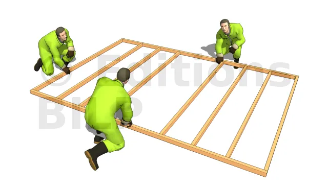 L’ossature du mur est assemblée à l’horizontale, à terre. Il peut être judicieux de continuer le montage à terre avec la pose du revêtement extérieur (bardage, panneaux, etc.). En effet, c’est plus confortable et plus pratique surtout avec la pose de panneaux lourds et encombrants, la gravité maintient le panneau contre l’ossature pendant qu’on le fixe. Si on adopte cette méthode, on construit l’ossature, on assure qu’elle est bien d’équerre puis on pose le revêtement. On lève ensuite le mur et on le fixe en place.