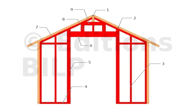 - 2 : Les montants centraux sont doublés pour mieux supporter la charge de la toiture transmise par