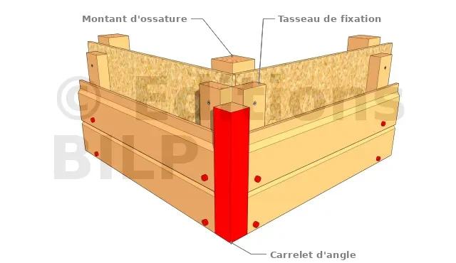Il existe des profilés préfabriqués en L que l’on peut fixer en angle. Cependant, il est très difficile de trouver des profilés faits dans du bois naturellement durable. C’est donc une solution simple, mais pas très pérenne. On la réserve donc pour une petite construction sans prétention.