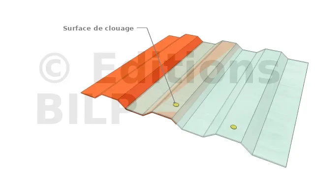 Les panneaux métalliques doivent être fixés par des pointes galvanisées (clous ou tire-fonds) avec des rondelles en caoutchouc ou des vis à tête hexagonale. La longueur des pointes doit être bien choisie de manière à ce que ces dernières ne dépassent pas les pannes lors du clouage. De plus, évitez de ne pas trop enfoncer les pointes pour ne pas endommager les caoutchouc ou comprimer les rondelles. Si les pointes sont trop élevées, la fixation pourrait lâcher et il est possible que le vent emporte le revêtement. De même, l’humidité pourrait s’infiltrer sous les rondelles.