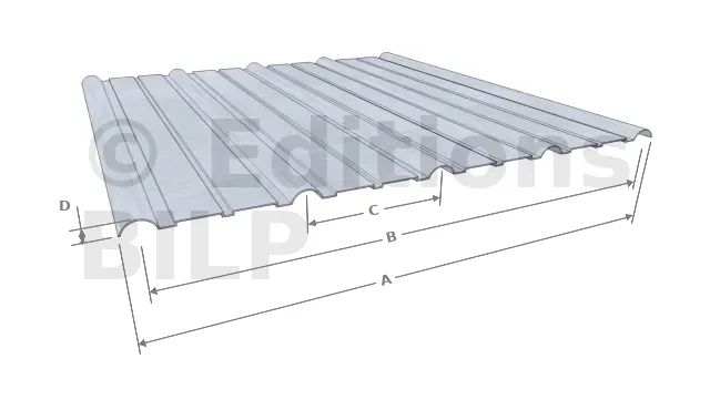 Le largeur standard des tôles galvanisées est souvent soit de 81 cm soit de 96,52 cm ( Comme on le montre dans cette figure). Pour ce dernier, il couvre une surface de 92 cm lors de la pose étant donné que les extrémités latérales doivent se chevaucher. Les ondulations de 1,91 cm sont rencontrées à intervalles de 22,86 cm. Pour la longueur, on a une dimension standard de 2,40 m mais on peut toujours commander n’importe quelle longueur.