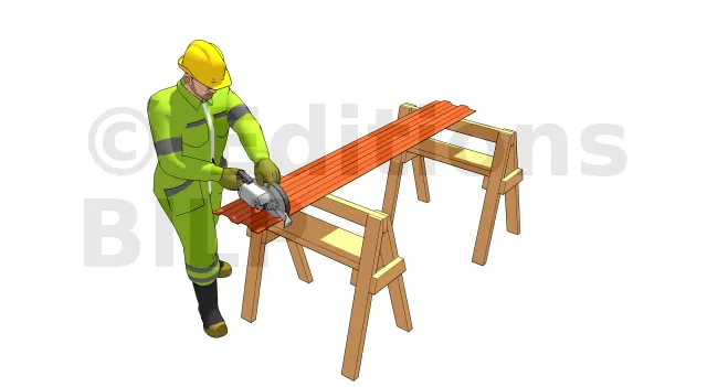 Même si le revêtement est en métal, il n’est pas difficile de le couper. Les tôles ondulées ou galvanisées se coupent facilement avec une scie circulaire dotée d’une lame de coupe spéciale pour métal facile à trouver dans les quincailleries. N’oubliez pas d’utilisez des protections comme des gans et des lunettes.