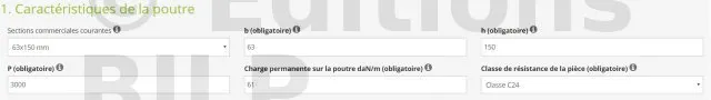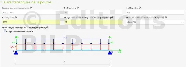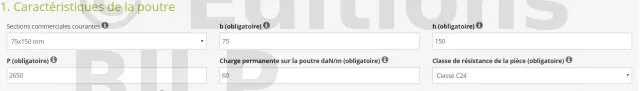 - 1. Caractéristiques de la pièce : section de la pièce, portée de la pièce, charge permanente sur la pièce, classe de résistance de la pièce et type de charge sur la pièce