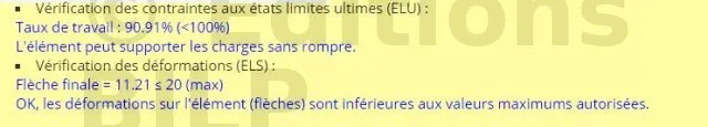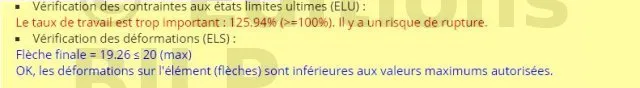 Une fois toutes les caractéristiques de la pièce remplies, l’outil va effectuer les calcul et vous dira si les caractéristiques sont vérifiées ou non. Dans le cas où elles ne sont pas vérifiées, vous devrez faire quelques modifications (exemple : modification de la section de la pièce, de la portée de la pièce, de la classe de résistance de la pièce,...)
