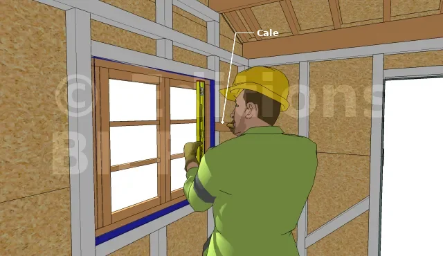 Lorsque la fenêtre à installer est à niveau, ajuster les montants latéraux avec des cales jusqu’à ce que le châssis de fenêtre soit parfaitement en équerre. Vous pouvez le vérifier en utilisant soit une équerre de charpente à l’intérieur des jambages ou en vérifiant les diagonales de l’ouverture de la fenêtre pour s’assurer qu’ils soient de même longueur.