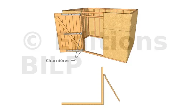 Fixer les charnières sur les cotés du battant de la porte. Ces charnières permettront à la porte de s’ouvrir et de se fermer librement. Toujours maintenir la porte bien fermée lorsque vous fixez les charnières pour que la fermeture soit totale. Placez des cales tout autour pour bien centrer la porte dans l’ouverture puis retirez-les quand les charnières sont en place.