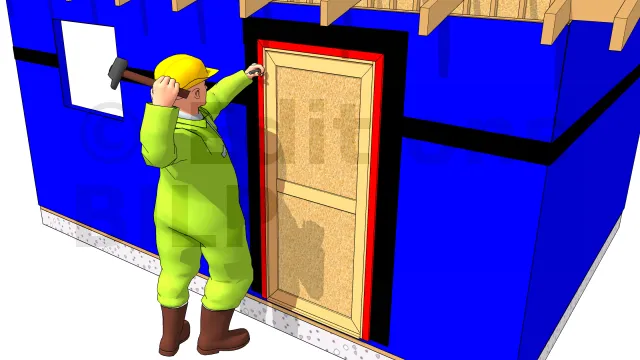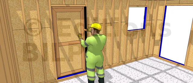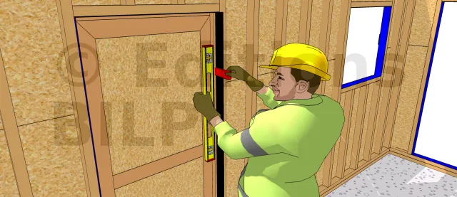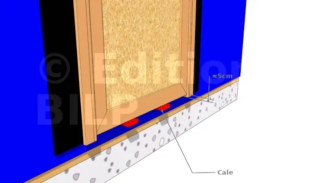 Si vous envisagez d’ajouter une finition de plancher intérieur ultérieurement, n’oubliez pas d’élever un peu la hauteur de la porte en positionnant des cales sous les montants du cadre dormant.