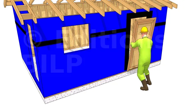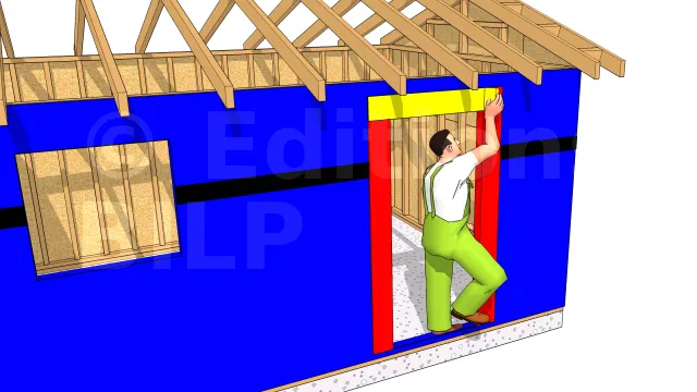 Prenez la porte à installer. Placez-la dans l’ouverture brute tout en s’assurant que les montants du dormant (le cadre extérieur de la porte) soient bien à l’intérieur. Bien centrer la porte de part et d’autre des côtés.