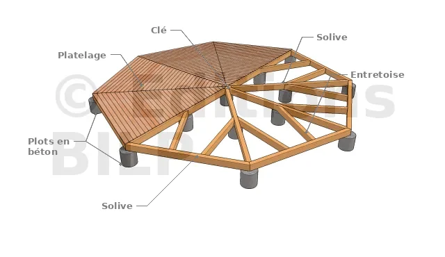 Cette plateforme est adaptée à des structures polygonales que sont les gloriettes, les gazebos et les kiosques. Elle est constituée de platelage en lame de terrasse ou de panneaux de bois et des solives. Si on se réfère d’une terrasse en bois, on est dans la même structure qu’une terrasse sur plots en béton.