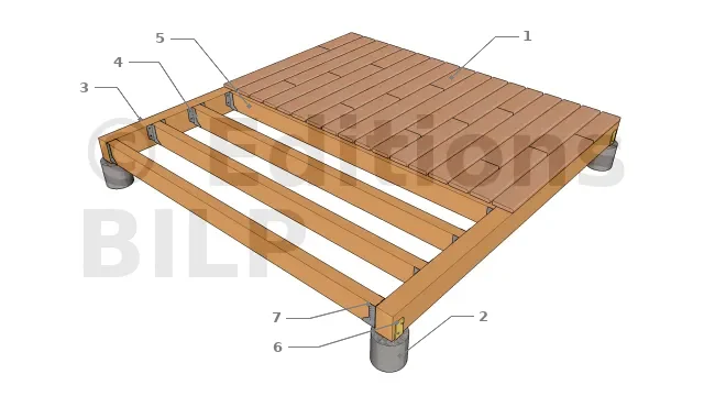 Ce type de plateforme se comporte comme une terrasse sur poutres porteuses. Les poutres porteuses vont former des arêtes parallèles sur des côtés de la plateforme. Les solives vont se fixer contre les faces de ces poutres avec des sabots de solives ou des vis adaptées en les transmettant les charges. Ce système est utilisé afin de minimiser la hauteur de la plateforme.