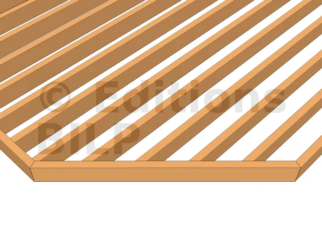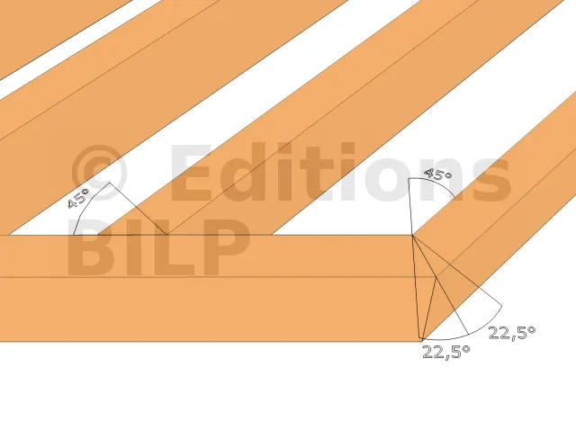 La réalisation d’un pan coupé se fait d’abord sur la structure. Les solives d’extrémité matérialisent l’angle. Leurs extrémités doivent former un angle de 22,5° (45° divisé par deux). Les solives droites arrivant contre la solive d’extrémité à 45° doivent être coupées à 45°.