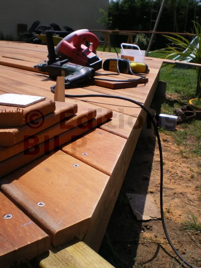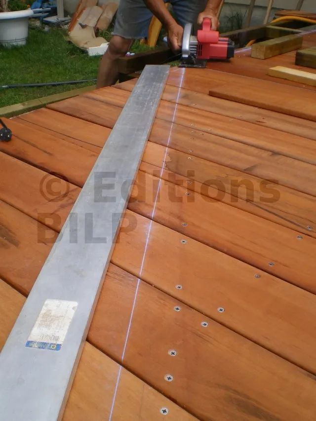 Les lames sont ensuite fixées sur la structure. Dans un premier temps, on laisse l’extrémité dans sa coupe d’origine, à 90°, en dépassant de quelques centimètres à quelques dizaines de centimètres. Quand toutes les lames sont posées, on trace la ligne de coupe avec précision, puis on effectue la découpe en une seule passe à la scie circulaire.