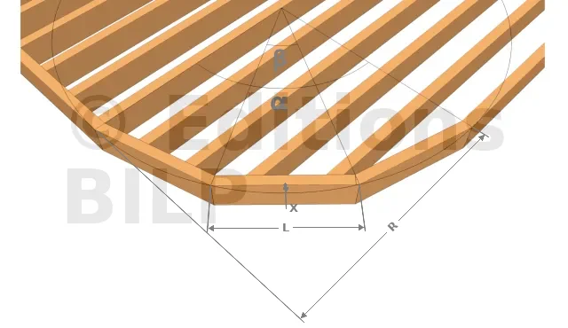 Connaissant, l’angle β et le rayon R, on peut calculer la longueur de la solive-bordure, grâce à la formule ci-dessous.