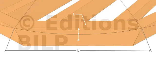 On découpe la structure en plusieurs (N) solives-bordures de façon à épouser la courbe. Plus N est élevé, plus X sera faible – ce que l’on souhaite – mais la mise en œuvre sera complexe et difficile. Il faut trouver le bon compromis en se rapprochant d’une valeur X inférieure à 10 cm. Dans la formule ci-dessous, remplacez Xmax par 10.