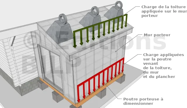 Charge permanente sur la poutre périphérique = (Charge permanente de l’ensemble plancher et toiture x Surface d’influence / Longueur de la poutre) + (Charge de l’ensemble du mur x largeur de la poutre)