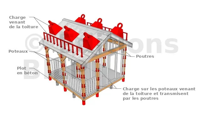 Prenons comme exemple ce modèle d’extension qui a été réalisé dans le département de l’Isère avec une altitude de 800 m. Ce modèle présente des poteaux et des pannes qui vont reprendre et transmettre les charges venant de la toiture. De ce fait, les poutres porteuses périphériques ne supportent plus que le poids du mur et du plancher.