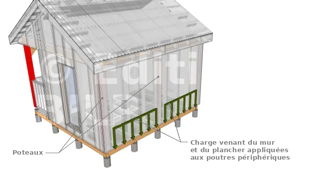 Comme pour le cas d’une plateforme supportant une construction avec un mur porteur, il vous faudra utiliser l’outil de calcul Vérifier une poutre pour ce cas. La différence entre ces deux cas résident sur le fait que pour notre cas, les poutres périphériques ne supportent que le poids du mur et du plancher. Elles ne reprennent plus donc les charges venant de la toiture dans la mesure où ces dernières sont déjà reprises par des poteaux et sont directement transmises à la fondation.