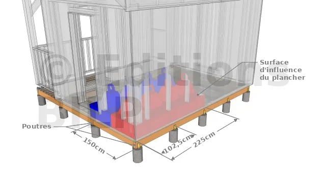 Comme un plancher en bois n’est porteur que dans un seul sens, la surface du plancher est donc à diviser en deux parties égales parallèlement aux deux poutres pour obtenir la surface d’influence. De ce fait, une poutre ne supporte que la moitié de l’espacement de chaque côté.