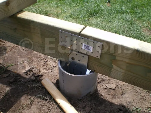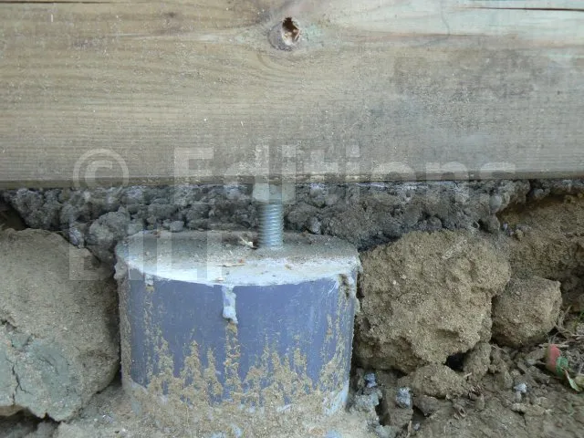 On peut aussi, comme dans l’exemple ci-dessous, fixer les connecteurs à la solive puis couler le béton dans un second temps. Le tube PVC peut servir de support à la solive avant coulage du béton. Cela signifie qu’il a été soigneusement mis à niveau. Pour cela, on peut sceller les tubes PVC dans la partie enfouie du plot, puis les mettre tous à niveau ultérieurement en s’aidant d’un niveau laser ou à fiole. Il est recommandé de ne pas remplir le plot jusqu’au bord (contrairement à l’exemple ci-dessous), car dans ce cas la solive est collée au béton, lui faisant courir un risque de pourrissement prématuré.