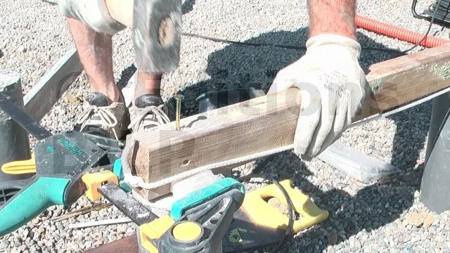 Si la solive fait moins de 10 cm de hauteur, il est possible d’utiliser des chevilles à frapper. La cheville est insérée au travers de la solive puis frappée. On dispose quelques cales PVC sous la solive pour éviter qu’elle ne soit en contact direct avec le béton. Dans un premier temps, on peut fixer uniquement les deux extrémités de la solive, et cela pour toutes les solives. Puis, quand tout est bien aligné, on place les fixations du milieu des solives, sans dévisser les chevilles d’extrémité.