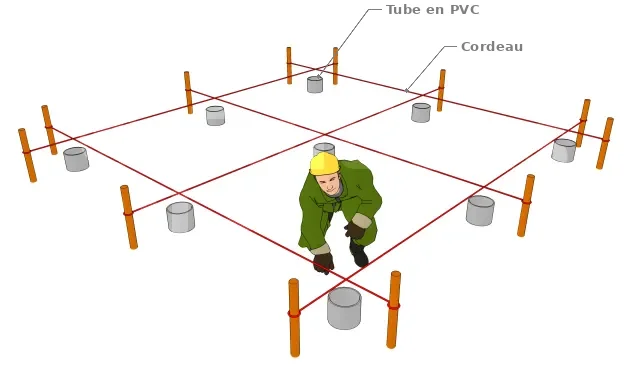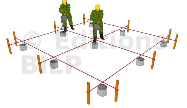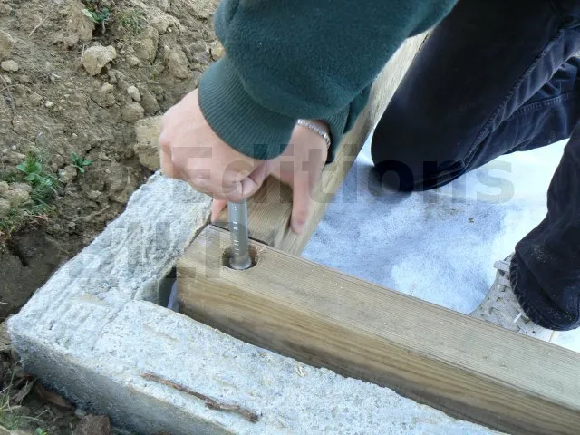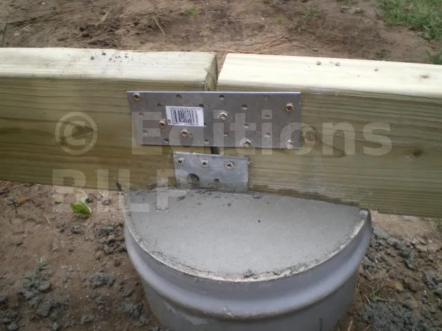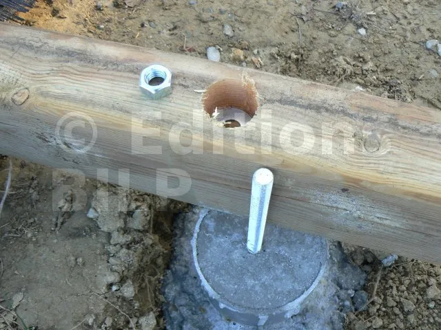 Dans l’exemple ci-après, les poutres sont fixées sur des plots en béton. Mais la même méthode est applicable aux autres types de maçonnerie tel qu’un mur en parpaings.